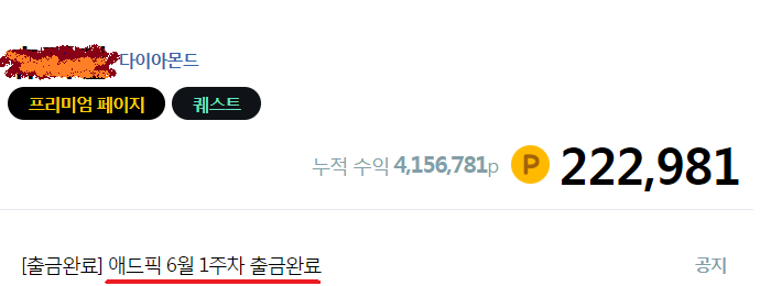 제 수익도 살짝 공개하겠습니다. 저는 애드픽을 1년 3개월 정도 운영해봤습니다. 매달 20만원~30만원 가량 수익이 발생했습니다. 지금까지 누적수익은 400만원이 넘었습니다.